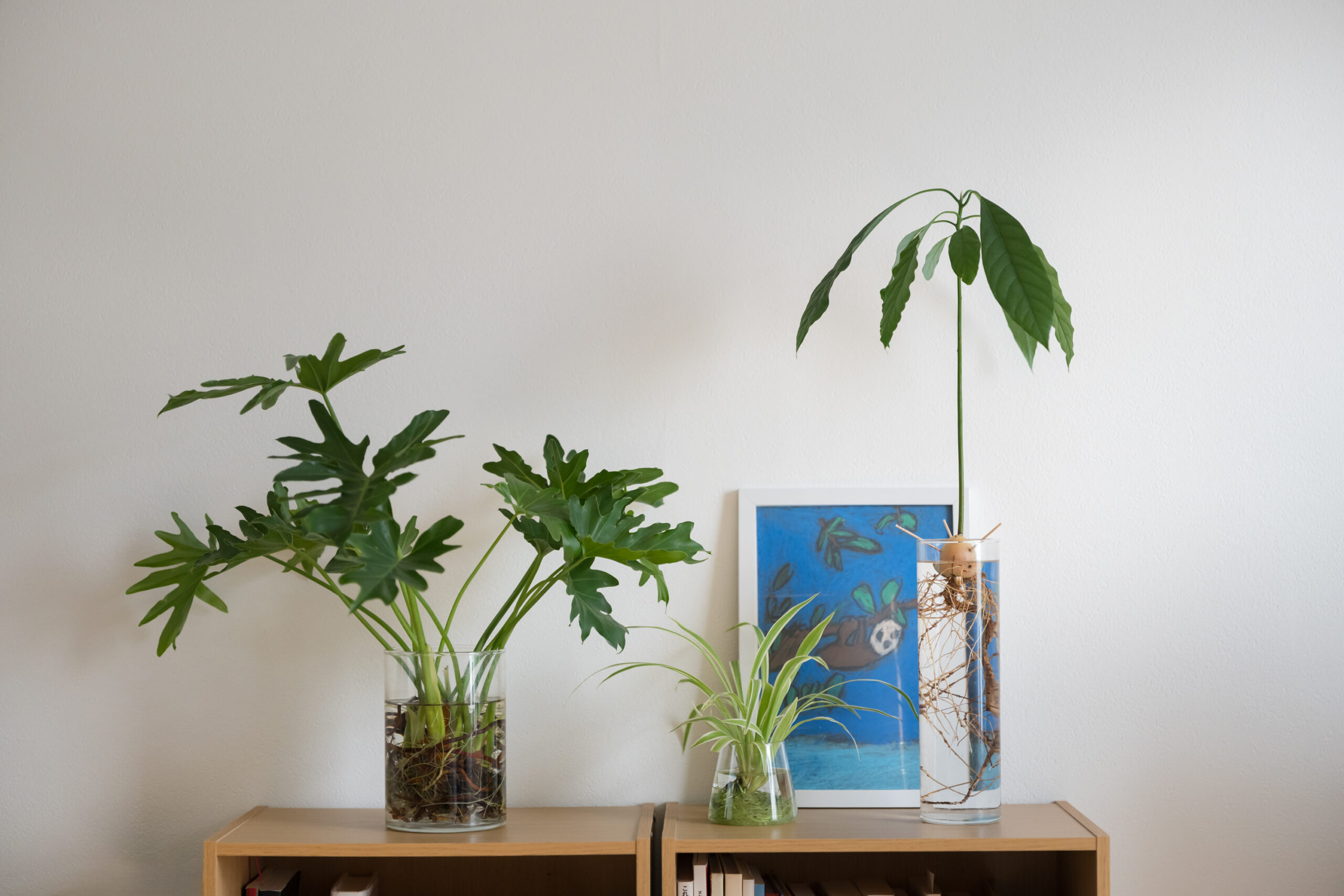 「子供が描いた絵と私が育てているグリーンたちです。どんなに忙しくても、自由な感性や植物の生命力に触れると、ニュートラルな状態に戻してくれます。右側のアボカドは種から育てて、ここまでの大きさに。アメリカのレストランで水栽培をしているのを見て、私も水栽培にチャレンジしています。根についた土を洗ってグラスに入れると、見た目もおしゃれで、おすすめですよ!(万出さん)」